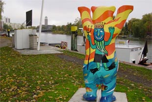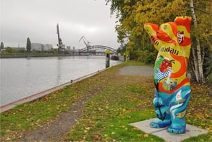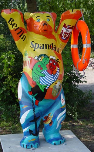 Dieser Buddy Bär steht am Havelufer in Berlin-Spandau auf dem Gelände einer Schiffsbunkerstation (Tankstelle für Schiffe und Boote) und erfreut mit seiner Anwesenheit die Passagiere der anlegenden und vorbeifahrenden Schiffe.