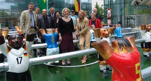 Klaus und Eva Herlitz, Mitarbeiter der Firma Buddy Bär und der Künstler auf dem Kicker